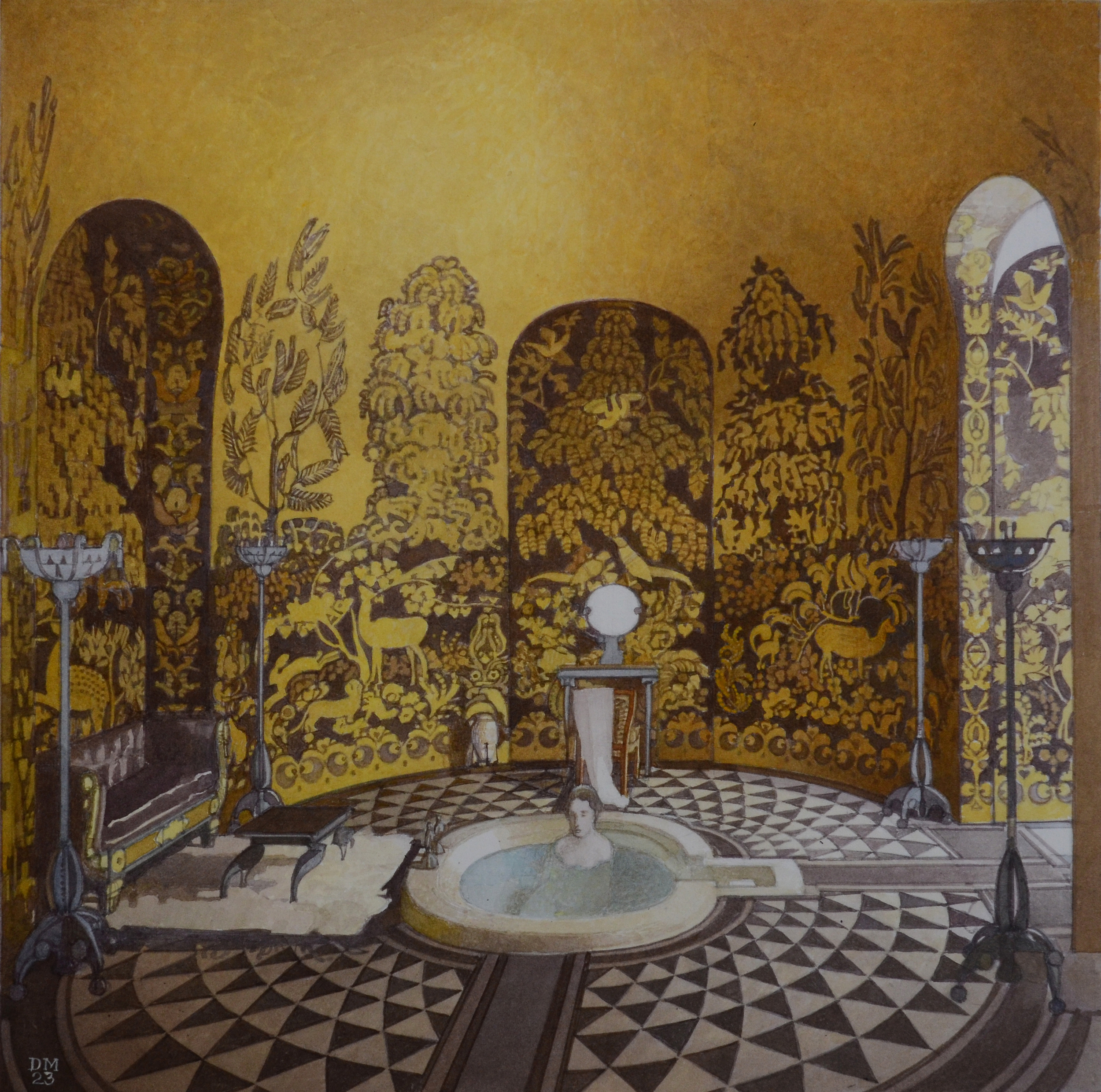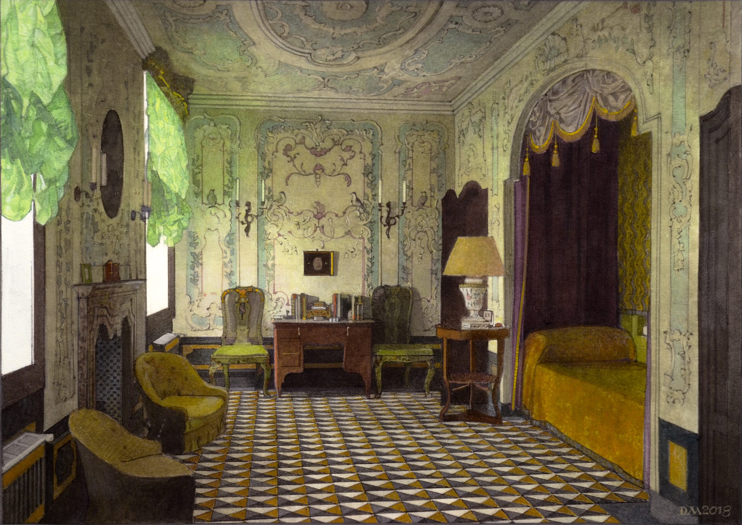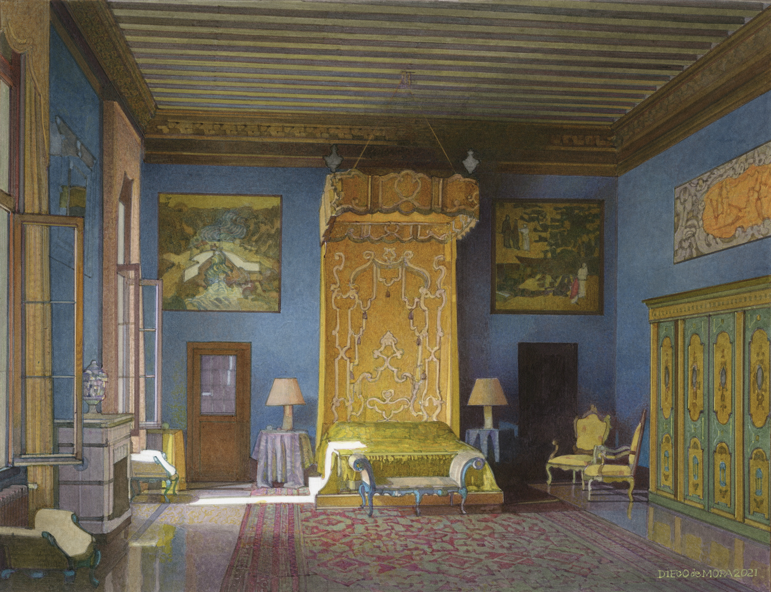 In the early decades of the 19th century, interior views flourished as an independent genre and enjoyed a veritable renaissance in post-World War II France thanks to Alexandre Serebriakoff. The young Diego de Mora met Serebriakoff when he was very old, in his Paris studio, and soon began to paint his own interior pictures with commissions ranging from the Royal Palace in Madrid to a ski club in St Moritz, from an Ottoman house on the Bosphorus to a Georgian house in Green Park, from a saddlery room in Extremadura to an Art Deco bathroom in Paris.
