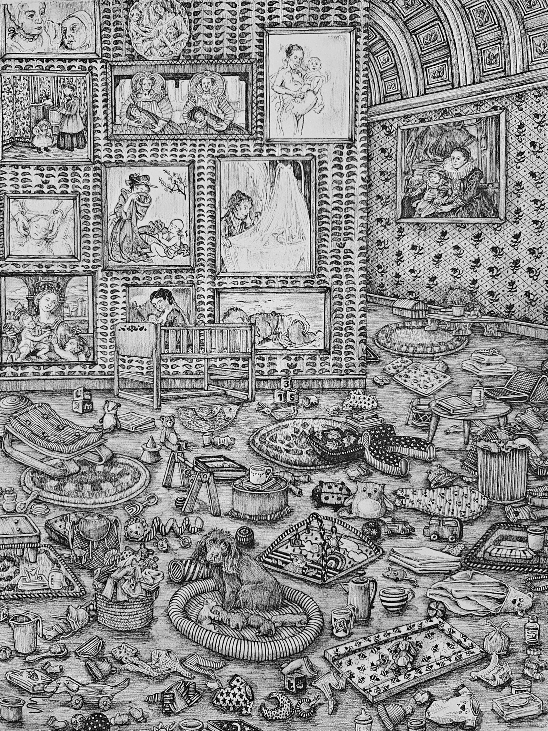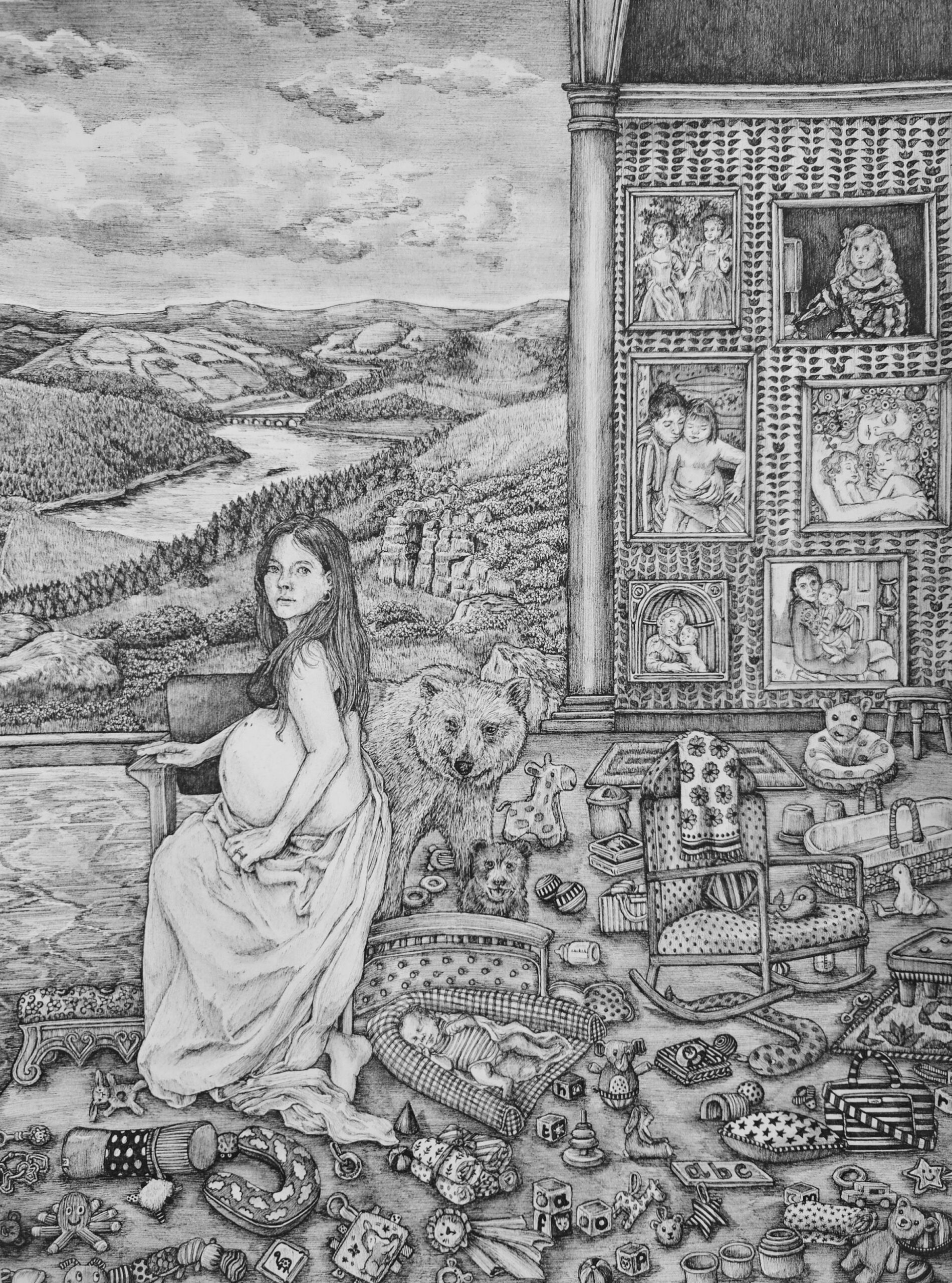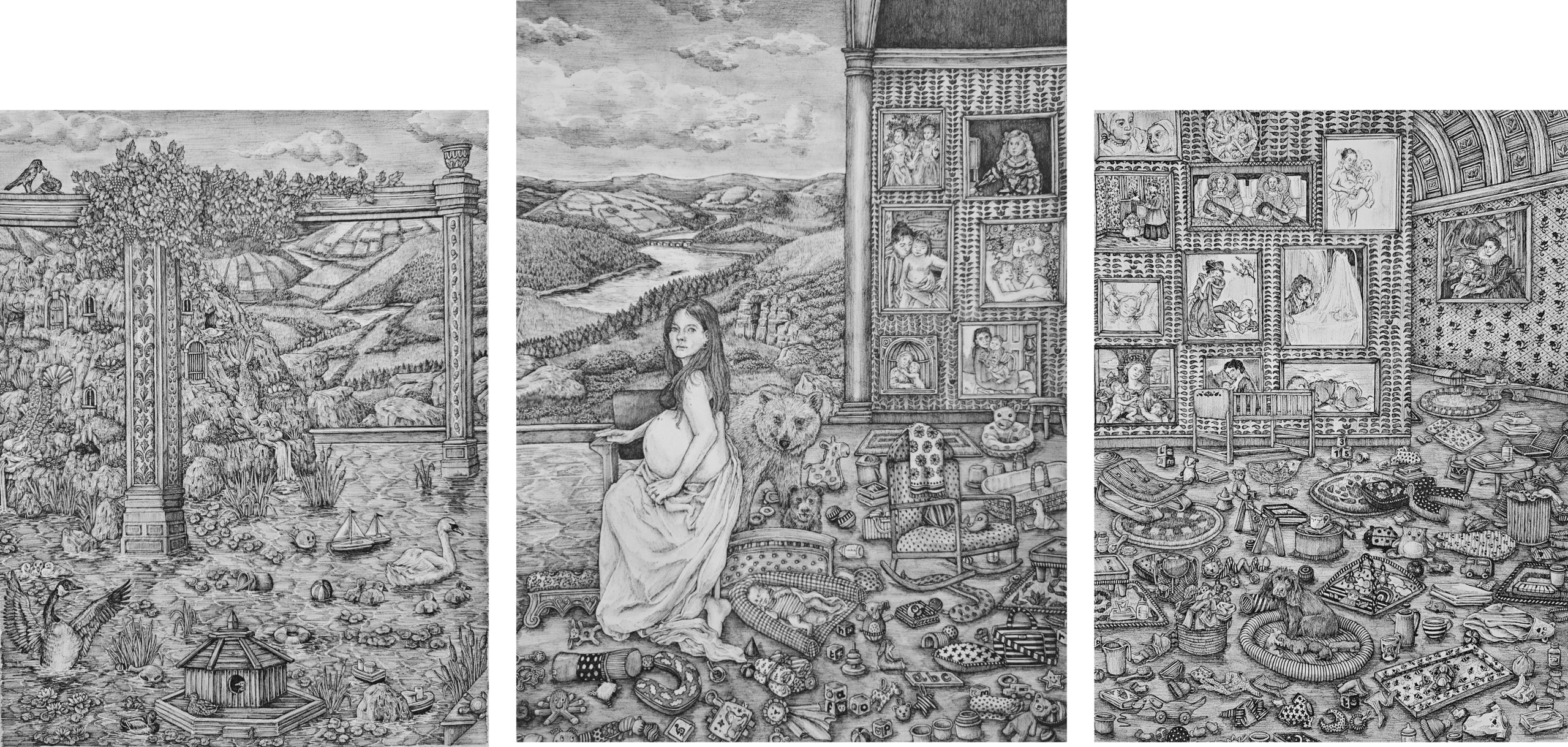 Linea nigra explores the motherhood ant its allegorical projection through Western Art tradition. A triptych that shows her expansive and syncretic concept of drawing. Since her 'Richard Ford Award' residency in the Museo del Prado in 2015; much of her work is inspired by art history and the classic painters. Her drawings are held in The Royal Collection (including the personal collection of King Charles), the Victoria & Albert Museum, The Rothschild Collection, among others.