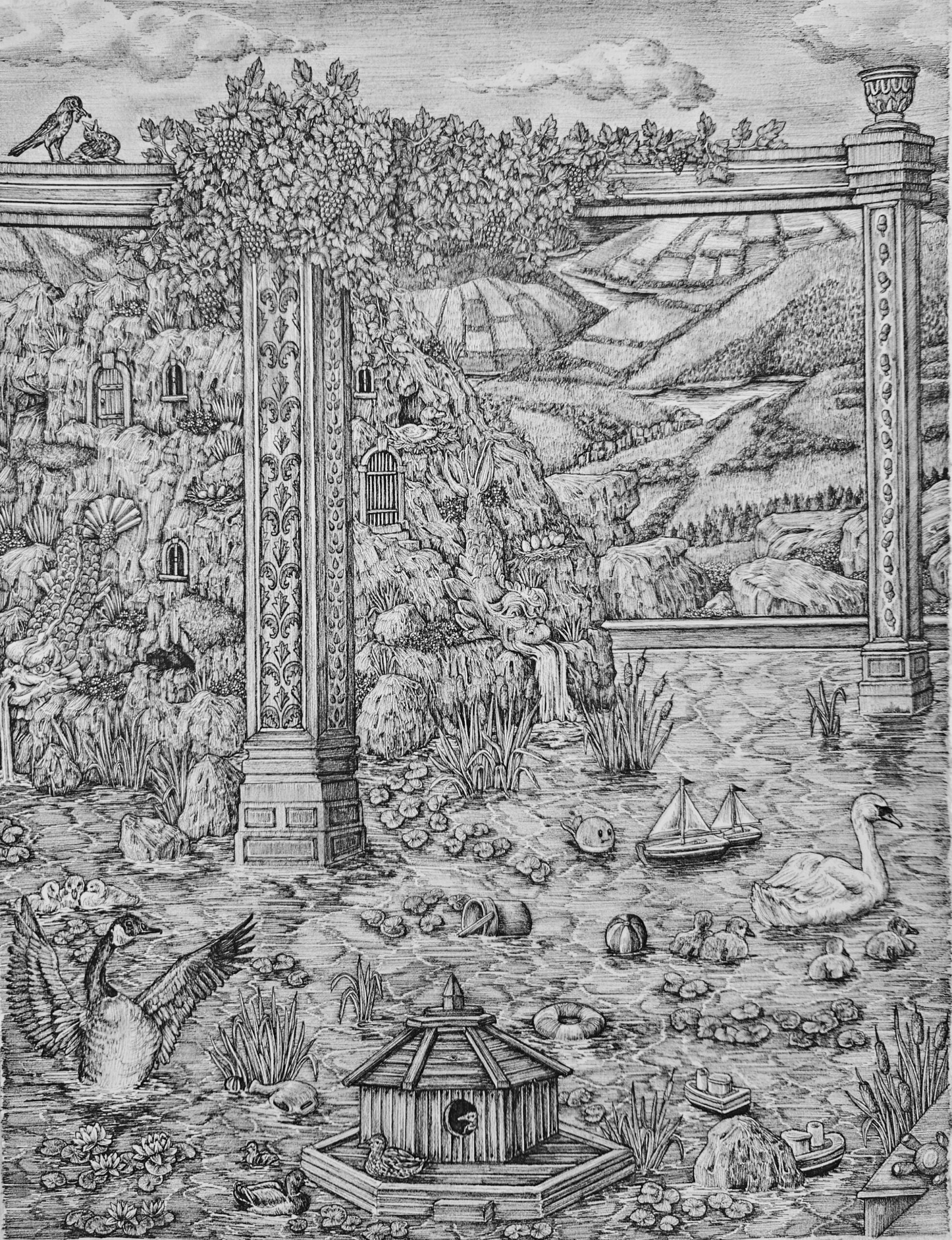 Water flowed through the nymphaea like the line runs across the paper in Olivia Kemp’s An Allegory of Motherhood. A line that contains her gesture and reflects her inner self, becoming a sign of identity. This is how it has appeared in Art theory since ancient times, as the origin of artistic expression and contingent upon its meaning. William Hogarth, in The Analysis of Beauty (1753), pointed out that the origin of beauty lies in that simple stroke. His ‘Line of Beauty’ is expressed as an elegant, undulating curve in the shape of an S – linea serpentinata – which embodies movement, vitality and visual pleasure. This line is the main source of beauty in nature and art, and is present in everything from human bodies to landscapes and objects, giving shape to the ideas that the artist expresses on paper.